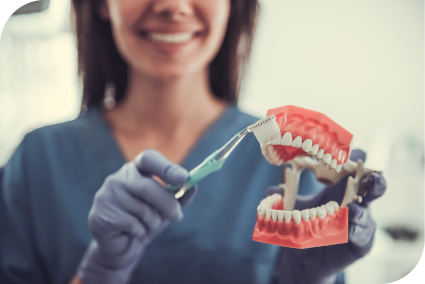 Le patient doit utiliser une brosse à dents adaptée, du fil dentaire spécifique ou des brossettes interdentaires, ainsi qu’un bain de bouche fluoré si nécessaire.
