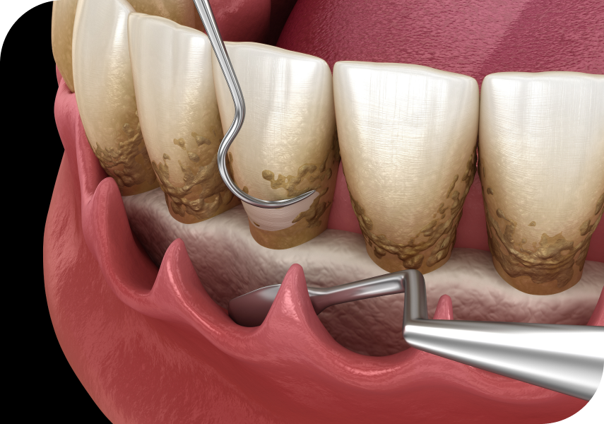 - Détartrage au-dessus et en dessous de la gencive.